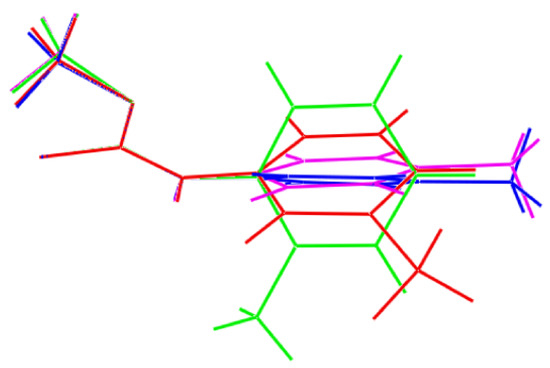 Superimposition of MeOC(=S)N(H)(tolyl) molecules for m-tolyl (1; red image), o-tolyl (green), p-tolyl (first independent molecule; blue) and p-tolyl (second molecule; pink). The molecules have been overlapped so the central NOS chromophores are coincident.