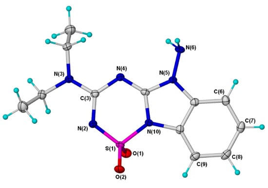NMR and mass spectral analyses alone did not allow an unambiguous structural assignment for fused thiatriazine 6; however, a signal at 5.88 ppm integrating for 2H in the 1H-NMR spectrum of 6 was indicative of an NH2 group, thereby narrowing the possibilities to either of structures 6 or 7. An unequivocal determination of the structure of 6 was achieved via X-ray crystallography (Figure 1 and Figure 2). In the 1H-NMR spectrum of the crude product (see Supplementary Materials), an additional minor resonance at 5.80 ppm, also indicative of an NH2 group, suggested that the minor isomer had structure 7. Neither of the expected seven-membered ring products 8 or 9 were observed. No obvious additional spots were noted during thin-layer chromatography (TLC) analysis of the mother liquor.