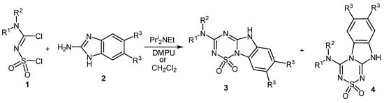 In the syntheses outlined in Scheme 1, the 2-aminobenzimidazoles 2 acted as 1,3-bis-nucleophiles in reactions with the 1,3-bis-electrophilic dichlorides 1 to produce six-membered ring products, the fused thiatriazines 3 (and 4), which are representatives of very rare ring systems.