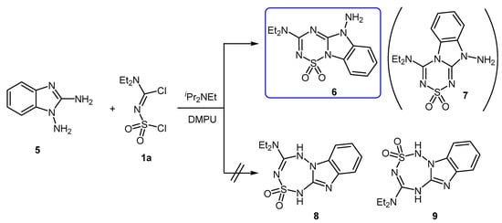 It appears that, in the present work, the reaction of diamine 5 with dichloride 1a under basic conditions, favors the 1,3-NCN bis-nucleophilic mode of reaction, affording the 5-amino-benzo[4,5]imidazo[1,2-b][1,2,4,6]thiatriazine 6.