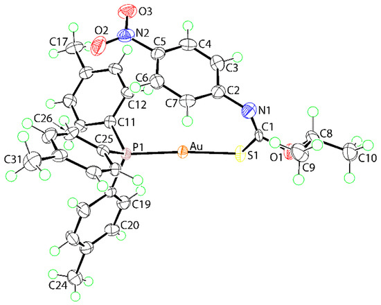 Compound 1 was prepared in good yield (79%) by standard methods [11] and was characterized by spectroscopy; see Supplementary Materials for original spectra. The NMR data showed the expected resonances and integration (1H). In the IR, characteristic bands ascribed to ν(C=N) [1330 (vs)], ν(C–O) [1139 (vs)] and ν(C–S) [1099 (vs)] were observed. No evidence was found for a signal due to N–H in the 1H-NMR spectrum or of a band due to ν(N–H) in the IR spectrum [12]. In the UV spectrum, the most prominent band at λabs 240 nm is attributed to the thiolate ligand-centered π→π* transition [13]. The two shoulders at 267 and 276 nm are assigned to intra-ligand transition of tri(4-tolyl)phosphane, while the band at 340 nm arises from the 1[n(S)→π*(C6H4NO2)] intra-ligand charge transfer [13]. Full characterization of 1 was achieved by single-crystal X-ray crystallography.