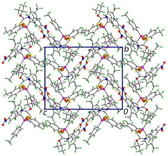 Each of the nitro-oxygen atoms participates in a C‒H…O interaction, with the donor atoms being methyl-H and tolyl-H. The other interaction identified is an end-on tolyl-C‒H…π(tolyl) contact. These interactions extend in three-dimensions to consolidate the crystal. A view of the unit cell contents is shown in Figure 2.