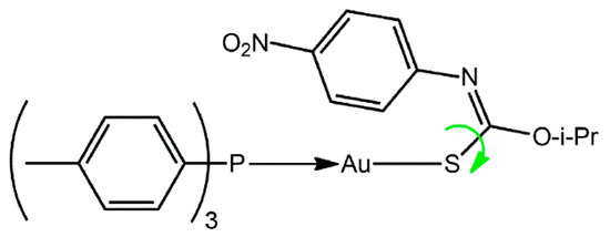 In conclusion, the X-ray crystal structure determination of (4-tolyl)3PAu[SC(O-i-Pr)=NC6H4NO2-4] confirms the spectroscopy and discloses an intramolecular, semi-localized Au…π interaction, which is expected based on electronic, steric, and thermodynamic grounds.