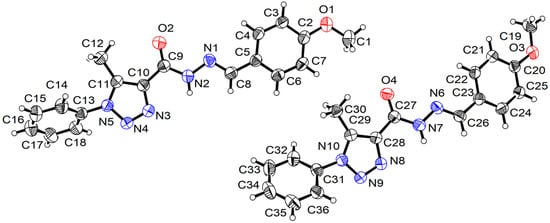 The crystal structure of 3 comprises two crystallographically independent molecules (Figure 1). A significant difference between the two independent molecules is the conformation of the methoxy group as indicated by the corresponding torsion angle C1–O1–C2–C3 = 178.34(67)° and C19–O3–C20–C21 = 6.14(66)°. The combined methoxybenzylidene-carbohydrazide group (A) is essentially planar in both molecules with maximum atomic deviations from the least-squares planes of 0.100(1) Å (for C1) and 0.162(1) Å (for O4) for the first molecule (C1–C18) and the second molecule (C19–C36), respectively. The molecules are completed by methyltriazole (B) and phenyl (C) moieties. The twist angles between the planes through A and B, and through B and C are 6.94(18)° and 50.91(13)° for the first molecule and 12.62(19)° and 45.18(20)° for the second molecule.