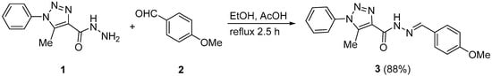 Arylidene carbohydrazides are remarkable compounds because of their activity as antimicrobial, analgesic, anti-inflammatory, antiproliferative, and antioxidant agents [,,,,]. Another interesting group of compounds is 1,2,3-triazoles, which may act as anticancer, antimicrobial, α-glucosidase inhibitors, and cholinesterase inhibitor agents [,,,]. 1,2,3-Triazoles can be synthesized from reactions of azides and calcium carbide, a source of acetylene, in a mixture of acetonitrile and water in the presence of copper iodide []; nitroolefins and sodium azide in dimethylformamide in the presence of a catalyst such as p-toluenesulfonic acid or Amberlyst-15 [,]; alkenyl halides and sodium azide in dioxane or dimethyl sulfoxide in the presence of a palladium catalyst []; alkyl bromides and acetylenes in water in the presence of bromotris(triphenylphosphine)copper(I) or copper(I) isonitrile [,]; and alkynoic acids, aryl iodides, and azides in a mixture of dimethyl sulfoxide and water in the presence of L-proline []. Our interest in the synthesis of arylidenes of 1,2,3-triazole emanates from ongoing research in the area of heterocycles [,,,,,]. In this paper, the synthesis and structure elucidation of N′-(4-methoxybenzylidene)-5-methyl-1-phenyl-1H- 1,2,3-triazole-4-carbohydrazide (3) are reported. The synthesis and structure elucidation for similar compounds have been recently published [].