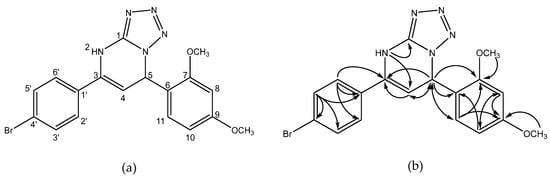 Based on 1H-NMR analysis, the existence of a 4,7-dihydrotetrazolo [1,5-a]pyrimidine skeleton was proved by three proton signals: a broad signal at 10.40 ppm indicated the existence of an amide-type –NH proton, while two other doublet signals formed an AX spin system at δH 6.64 (1H) and 5.17 ppm (1H, J = 3.7 Hz) indicated a vicinal correlation. The existence of 1,4 (para)-disubstituted benzene fragment was indicated by the two signals was convinced by two symmetrical double doublet signals (7.62 and 7.56 ppm, each 2H) with J = 8.6 Hz formed a AA’XX’ spin system. The existence of a 1,2,4-trisubstituted benzene ring is proven by the three signals of ABX system that appear at δH (d, J = 8.5 Hz, 1H), 6.60 (d, J = 2.3 Hz, 1H), and 6.52 (dd, J = 8.5, 2.3 Hz, 1H). Two methoxy signals attached at an aromatic ring were assigned by two signals (δHn 3.75 ppm, 3H and 3.73 ppm, 3H) (Supplementary materials, Figure S3).