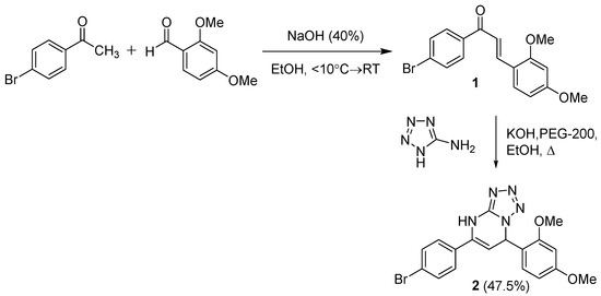 Firstly, the synthesis of the title compound was conducted by a one step multicomponent Biginelli reaction between 4′-bromoacetophenone, 5-aminotetrazole, and 2,4-dimethoxybenzaldehyde in ethanol as solvent, using pTsOH as catalyst []. However, we did not get the product. Therefore, we tried to synthesize the title compound in a two step reaction.