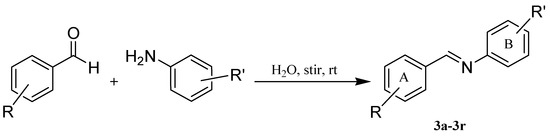 The designed compounds were synthesized by the reaction of different aniline derivatives with appropriate aldehydes in water as a green solvent without any catalyst (Figure 2). The synthesized derivatives (3a–3r) were obtained with high yields (>89%). Structure of the synthesized compounds was characterized by LC-MS 1H-NMR and 13C-NMR. The 1H-NMR spectra of the synthesized compounds exhibited a singlet peak for the CH=N proton between 8.51 and 8.96 ppm.