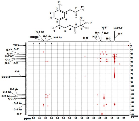 FTIR (KBr) υmax cm−1: 3482 (O-H), 2932, 2971 (CH aliphatic), 1762 (C=O ester), 1710 (C=O ketone), 1217 (C-O ester) [14]. 1H-NMR and 2D-HSQC (500 Hz, CDCl3), δ, ppm: 7.14 (1H, d, J = 8, H-4Ar), 6.95 (1H, d, J = 8, H-3Ar), 6.79 (1H, s, H-6Ar), 3.71 (1H, s, HO), 2.67 (1H, m, H-2, C-HC-Ar), 2.41 (2H, m, H-4, C-H2C-C=O), 2.31 (3H, s, H-1”, H3C-acetate), 2.14 (3H, s, H2’, H3C-Ar), 1.82 and 1.91 (2 peak: 1H, m and 1H, m, H-3, C-CH2-C), 1.26 and 1.27 (6H, 2 s, H-6’ and 7, 2 CH3-C), 1.25 (3H, d, J = 7, H-1, CH3-CH). 13C-NMR and HSQC (500 MHz, CDCl3), δ, ppm: 214.6 (1C, C-5, C=Oketone), 169.4 (1C, C-1’, C=Oacetate), 149.5 (1C, C-1Ar), 145.4 (1C, C-5Ar), 131.3 (1C, C-3Ar), 127.9 (1C, C-2Ar), 124.7 (1C, C-4Ar), 120.6 (1C, C-6Ar), 76.3 (1C, C-6, C-O), 38.9 (1C, C-2), 33.6 (1C, C-4), 31.8 (1C, C-3), 26.6 and 26.5 (2 peak 1C and 1C, C-6’ and 7), 22.7 (1C, C-1), 21.0 (1C, C-1”, CH3-acetate), 15.9 (1C, C-2’, CH3-Ar). DEPT: Quaternary carbon, δ (ppm): 214.6 (C-5, C=Oketone), 169.4 (C-1’, C=Oacetate), 149.5 (C-1Ar), 145.4 (C-5Ar), 127.9 (C-2Ar), and 76.3 (C-6, C-OH). Secondary carbons, δ, ppm: 33.6 (C-4) and 31.8 (C-3). HRESIMS (m/z) found 315.1563 ([M + Na]+), calculated masses for C17H24O4Na: 315.1572 (error −2.9 ppm).