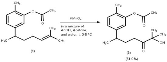 Xanthorrhizol, 2-methyl-5-[(2R)-6-methylhept-5-en-2-yl]phenol, is a major component extracted from Curcuma xanthorrhiza Roxb (Java turmeric) rhizomes. It has been established to have a variety of biological activities such as anticancer, anti-inflammatory, anticandidal, anti-hyperglycaemic, antibacterial, antioxidant, and anti-hypertensive [1,2,3,4,5,6,7,8,9]. Several xanthorrizol derivatives have been synthesized such as by esterification of the hydroxyl group, bromination of the phenyl ring, and epoxidation, asymmetric dihydroxylation, or hydrogenation of the carbon-carbon double bond of the compound [10,11]. Permanganate is a well-known and versatile oxidizing agent used to oxidize the carbon-carbon double bonds in organic chemistry [12]. However, there is no report of the use of this reagent for oxidation of xanthorrizol or its derivatives. Herein, we reported the oxidation of 1-O-acetyl-xanthorrizol using permanganate to acquire a new xanthorrizol derivative, 5-(6-hydroxy-6-methyl-5-oxoheptan-2-yl)-2-methylphenyl acetate.