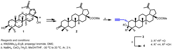 In the synthesis of the target triterpenoid 6, C-2 propargyl derivative of betulinic acid 5 was used as the starting compound, which was obtained in several stages from betulin by the method previously developed by our research group [14] (Scheme 1). The key stage of the scheme was α alkylation with propargyl bromide of potassium enoxytriethylborate generated from methylbetulonate 2 under the action of KN(SiMe3)2-Et3B. Stereoselective reduction of the keto group in the propynyl derivative of betulonic acid 3 using NaBH4 modified with CeCl3, produced methylbetulinate 4 in good yield [14] (Scheme 1).