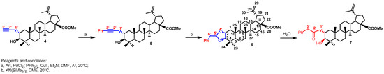The starting compound 4 was transformed into triterpenoid 5 by Sonogashira cross-coupling in the presence of PdCl2(PPh3)2, CuI and Et3N (Scheme 2). Triterpenoid 5 heterocyclization was carried out under the action of KN(SiMe3)2 in DME. The reaction proceeded at room temperature and in a short period of time yielded a single product, that is target triterpenoid 6, with a yield of 82% (1H- and 13C-NMR spectra). It is interesting to note that only 5-exo dig cyclization occurred and stereoisomerically pure compound (Z-5) was found. We did not detect pyran derivatives derived from 6-endo cyclization and stereoisomer (E-5) even in the trace amounts. Exocyclic enol ethers are known to easily undergo hydrolysis [16,17]. The triterpenoid 6 obtained by us showed protolytic stability during long-term storage (12 months) in an inert atmosphere at a temperature of ±5 °C. However, it was easily hydrolyzed to give phenylaceton-3β-hydroxylup-20(29)-en-28-oate 7 in chloroform-d within 6 h, producing a mixture of compounds 6 and 7 in 60:40 ratio (1H- and 13С-NMR). During the purification of triterpenoid 6 by the method of column chromatography on SiO2, an analytically pure sample of the compound was isolated in 32% yield along with its hydrolysis product, that is triterpenoid 7 in 51% yield.