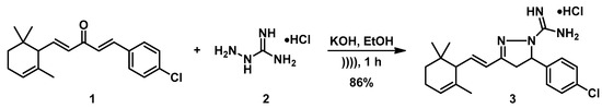 - Pizzuti, L.; Martins, P.L.G.; Ribeiro, B.A.; Quina, F.H.; Pinto, E.; Flores, A.F.C.; Venzke, D.; Pereira, C.M.P. Efficient sonochemical synthesis of novel 3,5-diaryl-4,5-dihydro-1H-pyrazole-1-carboximidamides. Ultrason. Sonochem. 2010, 17, 34–37. [Google Scholar] [CrossRef] [PubMed]