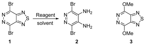 Sodium borohydride (NaBH4) or lithium aluminum hydride (LAH) were commonly used in the reductive cleavage of the 1,2,5-thiadiazole ring to ortho-diamine moiety [13]. We found that the treatment of pyridazine 1 with NaBH4 in EtOH in the presence of catalytic CoCl2·6H2O or with LAH in THF at reflux led to full decomposition of the starting material. Apparently, pyridazine 1 was found to be very sensitive to strong reducing agents. During our investigation of the nucleophilic substitution in 4,7-dibromo[1,2,5]thiadiazolo[3,4-d]pyridazine 1 by alkoxide anions we observed the formation of the new compound as a side product which was proved by mass-spectrometry to be 3,6-dibromopyridazine-4,5-diamine 2. We showed that the treatment of 1 with sodium methoxide in MeOH led to the formation of bis(methoxy) derivative 3 [12] with a traces of diamine 2 (Entry 3). To develop the synthetic approach to the target compound 2 we investigated this reaction in other solvents. The best yield was achieved after refluxing in THF for 3 h (Entry 4). The use of acetonitrile with higher (Entry 5) boiling point did not improve the yield of the target diamine 2. The results are summarized in Table 1.