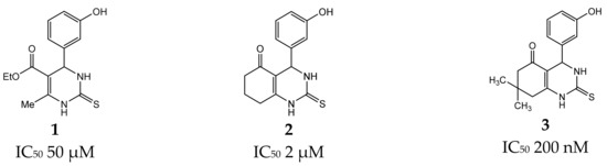 - Comas, H.; Buisson, D.A.; Najman, R.; Kozielski, F.; Rousseau, B.; Lopez, R. Synthesis of 5-acyl-3,4-dihydropyrimidine-2-thiones via solvent free, solvent-phase and solid-phase Biginelli procedures. Synlett 2009, 11, 1737–1740. [Google Scholar]
