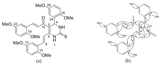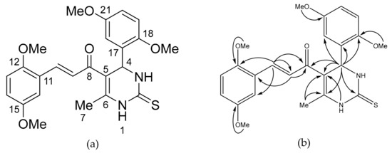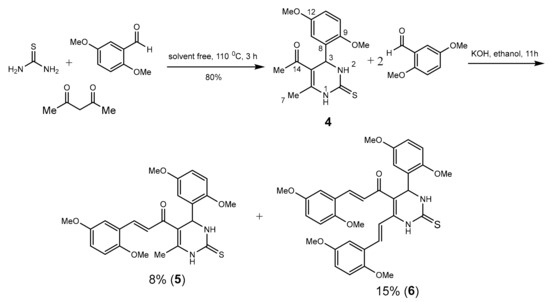 Suwito, H.; Kurnyawaty, N.; Susetyo, E.; Azizah, Y.; Haq, K.U.; Novi Kristanti, A.; Indriani, I. (E)-3-(2,5-Dimethoxyphenyl)-1-{[4-(2,5-dimethoxy-phenyl)-6-((E)-2,5-dimethoxystyryl)-2-thioxo-1,2,3,4-tetrahydropyrimidin-5-yl]}prop-2-en-1-one and (E)-3-(2,5-Dimethoxyphenyl)-1-{[4-(2,5-dimethoxyphenyl)-6-methyl-2-thioxo-1,2,3,4-tetrahydropyrimidin-5-yl]}prop-2-en-1-one. Molbank 2019, 2019, M1063. https://doi.org/10.3390/M1063