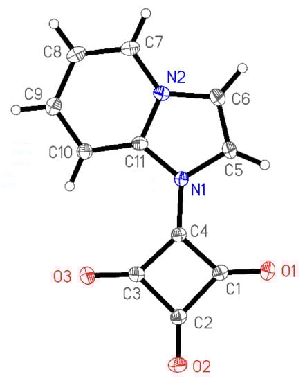 - Korkmaz, U.; Bulut, I.; Bulut, A. Crystal structure of 2-ethyl-4-methyl-1-(2-oxido-3,4-dioxocyclobut-1-en-1-yl)-1H-imidazol-3-ium. Acta Crystallogr. 2016, E72, 998–1001, (Refcode AQAGOC). [Google Scholar] [CrossRef] [PubMed]