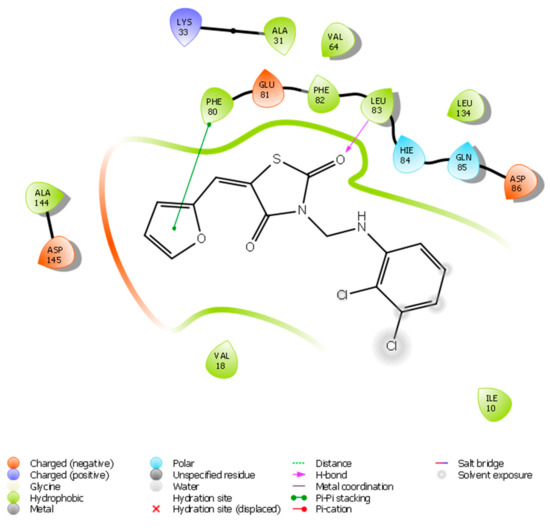 The oxygen of the thiazolidinedione ring receives a hydrogen bond from Leu83, whereas the furan ring makes a π–π stacking bond with Phe80. There are also three aromatic hydrogen bonds with Asp145, Leu83, and Hie84. The title compound also makes many hydrophobic interactions with the residues which surround the binding pocket, such as Gln131, 85, Ile10, Asp86, Phe82, Glu81, Val64, Leu134, Ala144, Hie84, Val18, and Lys33. The molecule affinity toward the protein is explained by all of these interactions, and the docking score of the molecule is 7.299 kCal/mol.