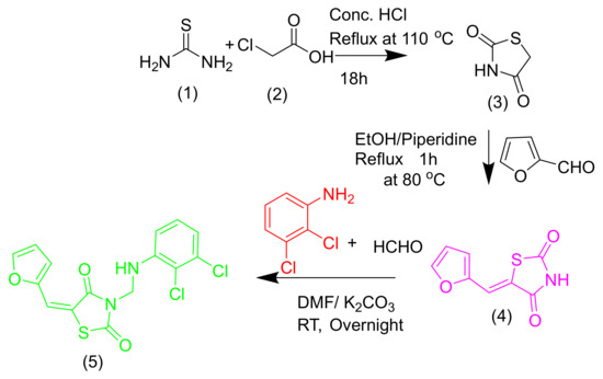 The synthesis of the title compound is outlined in Scheme 1. The reaction of thiourea 1 on 2-chloroacetic acid 2 in concentrated HCl under a reflux condition of 110 °C for 18 h gives thiazolidine-2,4-dione 3, which is the key intermediate [10]. Product 4 was given by the base-catalyzed condensation of thiazoline-2,4-dione 3 with thiophen-2-carbaldehyde/furfural. End product 5 was synthesized by dissolving compound 4 (0.01 mol) in dimethylformamide (DMF) (20 mL) in the presence of K2CO3 (0.02 mol). The reaction mixture was stirred for 30 min at RT, and then 1.5 mL of formaldehyde (40%) was added. The 2,3-dichloroaniline was added to it under stirring condition. The resulting precipitate obtained by filtration was washed with ice water, dried, and then recrystallized from methanol to get a pure white color compound of 55% yield.