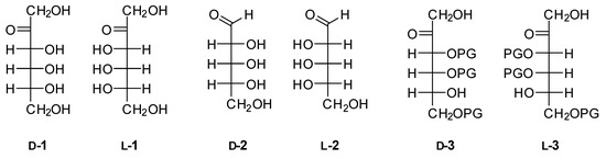 Fischer projection of d- and l-psicose (1), d- and l-ribose (2) and d- and l-psicose derivatives 3. PG—protective group.