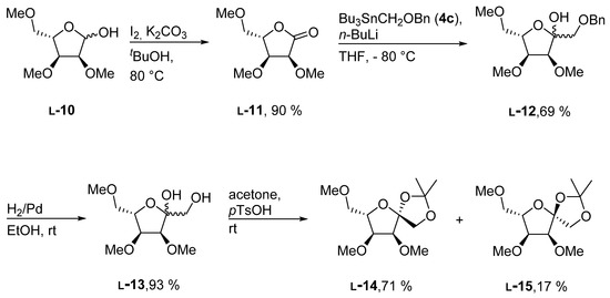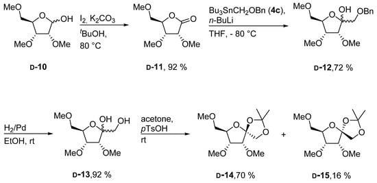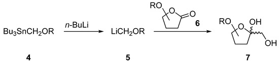 We first established a synthetic route starting with the cheap d-enantiomer of ribose and applied our findings later to the more expensive l-enantiomer. Since ribose is a pentose and psicose a hexose, the carbohydrate chain of the ribose had to be elongated by one carbon atom. Our strategy for accomplishing this was to first convert ribose to the corresponding lactone 6 and then elongate its carbon chain at C-1 via addition of the organometallic reagent 5 (Scheme 1). The latter could be obtained from tributylstannyl methanol 4 by transmetallation with butyl lithium and had already been used for the elongation of other carbohydrate derivatives [14,15,16,17].
