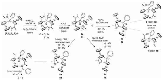 The synthetic route towards homoannularly bridged diferrocenes 4 is shown in Scheme 1. We obtained the enantiopure diferrocenyl precursor (R,Sp,Sp,R)-1 [,] according to a known efficient literature procedure []. The phosphorous atom was protected quantitatively as phosphine oxide 2a using hydrogen peroxide or as phosphine sulfide 2b with elemental sulfur. The preparation of precursor 2b is reported in Reference [].