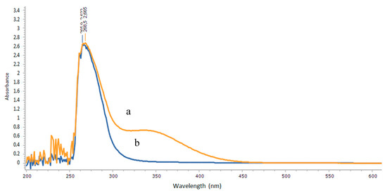 As shown in Figure 1, the λmax of N′-(3-chlorobenzoyl)isonicotinohydrazide was obtained at 268 nm and the λmax of the title complex was obtained at 265 nm. The formation of the title complex was indicated by weakening of the shift from 268 nm (Figure 1a) to 265 nm (Figure 1b).