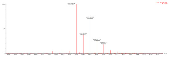 The mass spectrum is presented in Figure 4. The molecular ion peak at m/z 609.0142, corresponding to the molecular weight of the complex, was detected in the mass spectrum of the title complex [Fe(C13H10ClN3O2)2].
