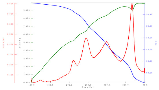 As shown in Figure 5, there is one endothermic peak at 383 °C. The thermogram of TG analysis showed the release of molecules marked by a reduction in mass at a certain temperature. The endothermic peak at 383 °C indicates that the decomposition complex begins with the release of several water molecules [10].