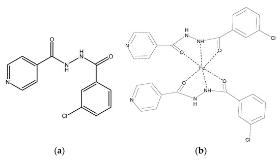 In recent years, our research group has synthesised and tested isonicotinylhydrazide derivatives, namely N-benzoylisonicotinohydrazide. These compounds are known to have antituberculosis activity. One of the synthesised compounds was N′-(3-chlorobenzoyl) isonicotinohydrazide as a result of the reaction between isonicotinohydrazide with 2-Chlorobenzoyl chloride through an acylation reaction and this compound has been tested for activity in mycobacterium tuberculosis (H37Rv) with a Minimum Inhibitory Concentration value (25 ppm) [18,19]. One of the widely used methods for drug development is the modification of compounds into complexes with metals, as the formation of complex compounds has been proven to increase the pharmacological activity [14,16,20,21]. Recently, the bis (N′-(3-chlorobenzoyl) isonicotinohydrazide)iron(III) complex has been synthesised as an antituberculosis drug candidate.