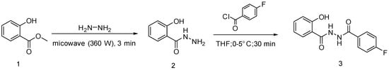 The synthesis was performed according to previously published work [10]. 20 mmol of methyl salicylate (2.6 mL) (1) was mixed with 80 mmol of hydrazine hydrate 80% (3.2 mL) and irradiated in microwave (360 W). Reaction completion was monitored using TLC. After 3 min the reaction was deemed complete. The mixture was then washed with distilled water and the separated solid was collected by filtration. Recrystallization with ethanol 96% was performed to obtain salicylhydrazide (2) with the yield of 61.1%. The following step was acylation of salicylhydrazide (1.3 g) (2) with equimolar amount of 4-fluorobenzoyl chloride (1.0 mL) (8.5 mmol), pre-mixed in THF. The reaction was conditioned at low temperature (0–5 °C) in an ice bath. Reaction was monitored using TLC until completion after 30 min. The mixture was then washed with cold ethanol and filtered in vacuo, followed by recrystallization with ethanol 96% to obtain the target compound 2-hydroxy-N′-(4-fluorobenzoyl)benzohydrazide (3).