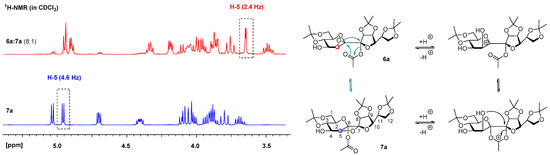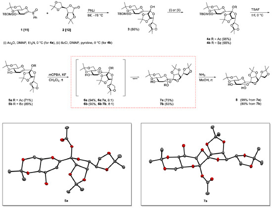 Furthermore, the configuration could be confirmed by growing crystals of 5a suitable for X-ray diffraction by recrystallization of the latter from n-hexane and ethyl acetate. Compound 5a was obtained through desilylation of 4a with tetra-n-butylammonium fluoride (Scheme 1). The moderate yield of 71% can be explained by detectable partial cleavage of the acetyl group in alkaline milieu during desilylation. The benzoyl protecting group was significantly more stable under the same conditions resulting in a yield of 89% for the conversion of 4b to 5b. In our efforts to synthesize symmetrical dodeco-6,7-diuloses both sugar moieties need to be manno-configured. Therefore, the next step was to stereoselectively convert the glycal entity into a mannose derivative. Conventional methods for the implementation of stereoselective dihydroxylation on similar allyl alcohol systems use substrate-directing reagents such as molybdenum catalysts [15], vanadyl acetylacetonate (VO(acac)2) [16,17] or meta-chloroperbenzoic acid (mCPBA) [17,18] for epoxidation. Subsequent epoxide opening leads to the desired diol derivatives. When these methodologies were applied to disaccharides 5a and 5b the best results were achieved using the Camps reagent (mCPBA/KF) [18,19]. The addition of potassium fluoride reduces the solubility of mCPBA and mCBA and thus, inhibiting nucleophilic epoxide opening by the acids. However, we could not isolate the pure epoxides 6a and 6b for a rapid rearrangement of the latter to oxetane species 7a and 7b occurred. Upon early quenching of the epoxidation reaction, only 8:1 mixtures of epoxide and oxetane could be isolated in yields of 94% for 6a and 90% for 6b, respectively. In order to enable the complete conversion of the epoxide to the oxetane derivatives the reaction times were extended and 7a and 7b could be obtained neatly in 70% and 63% yields, respectively. Crystals of compound 7a suitable for X-ray crystallography could be obtained by overlaying a saturated solution of 7a in methylene chloride with n-heptane and slowly evaporating the methylene chloride. Thus, the oxetane-bridged disaccharide structure of 7a with two anomeric α-configurations could be unambiguously verified (Scheme 1). For the formation of oxetanes 7 we propose a mechanism deduced from the X-ray data in which ester group migration from position 7 to 6 occurs simultaneously with O-heterocyclic ring extension of the oxirane ring to the less strained oxetane ring (Figure 1). The rearrangement process can also be visualized by 1H-NMR spectroscopy since the H-5 signal of oxetane 7a (4.96 ppm, 4.6 Hz) is significantly shifted to lower field compared to the characteristic doublet of H-5 in epoxide 6a (3.66 ppm, 2.4 Hz) (Figure 1). To some extent, this rearrangement resembles the Ferrier rearrangement of acetylated glycals. Alternatively, a stepwise mechanism via the intermediate formation of carbenium ions can also be envisaged.