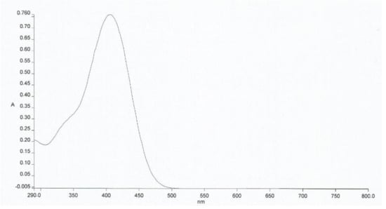 Compound 4 was characterized by means of HRMS, IR, and multinuclear NMR spectroscopy, the data obtained being fully in accord with the proposed formulation (details are given in the Materials and Methods section; copies of the NMR spectra are provided as Supplementary Materials). In this regard, key spectroscopic features are the following: (i) (IR) the presence of a characteristic absorption band at 1699 cm−1 for the carbonyl group, (ii) (1H NMR) typical signals for the olefinic protons of the butadiene chain at δH 6.59 (d, 3JHH = 15.0 Hz), 6.82 (d, 3JHH = 11.7 Hz), and 7.75 (dd, 3JHH = 15.0 and 11.7 Hz) ppm, with the coupling constant of 15.0 Hz confirming the E stereochemistry of the CH=CH bond, and (iii) (13C{1H} NMR) characteristic quartet resonances for the CF3 and C=O carbons at δC 116.6 (1JCF = 291.0 Hz) and 179.9 (2JCF = 34.6 Hz) ppm, respectively. On the other hand, as previously observed for 3, the UV-Vis spectrum of 4 in CH2Cl2 also displayed an intense absorption band in the visible region (λmax = 406 nm; Figure 1).