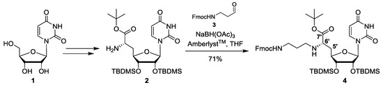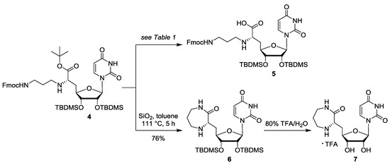 - Spork, A.P.; Wiegmann, D.; Granitzka, M.; Stalke, D.; Ducho, C. Stereoselective Synthesis of Uridine-Derived Nucleosyl Amino Acids. J. Org. Chem. 2011, 76, 10083–10098. [Google Scholar] [CrossRef]