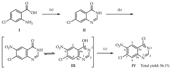 Synthesis of 4,7-dichloro-6-nitroquinazoline (IV). Reagents and conditions (yield): (a) HCO-NH2, reflux at 160 °C (82.3%); (b) HNO3/H2SO4 (84.7%); (c) SOCl2/DMF at 100 °C (91.3%).