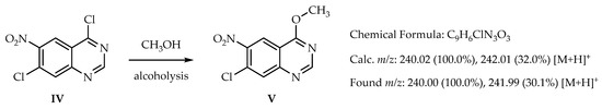 The formation of 7-chloro-4-methoxy-6-nitroquinazoline (V) by alcoholysis with methanol in MS.