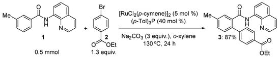 The requisite starting amide, 3-methylbenzamide bearing 8-aminioquinoline as a directing group (1) was prepared according to literature procedures from the corresponding acid chloride [,]. The benzamide was then subjected to the Ru-catalyzed C-H bond arylation conditions. Thus, amide (1) was reacted with ethyl 4-bromobenzoate upon treatment with [RuCl2(p-cymene)]2 (5 mol %) as a precatalyst and (p-tol)3P (40 mol %) as a ligand in the presence of Na2CO3 (3 equiv.) as a base (Scheme 1).