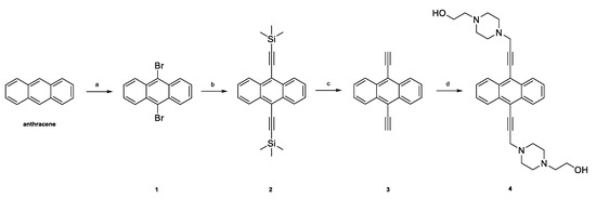 The target compound 9,10-bis[(4-(2-hydroxyethyl)piperazine-1-yl)prop-2-yne-1-yl]anthracene (4) was synthesized by a multi-step procedure starting from anthracene (Figure 1). This was selectively brominated in positions 9,10 with elemental bromine producing compound 1. The resulting intermediate was subjected to a Sonogashira coupling reaction with trimethylsilylacetylene (TMS) on the two bromide atoms to insert the alkyne groups, giving compound 2. These functions were then deprotected in basic conditions affording compound 3. Analytical data were found in agreement with previous reports [16]. The final compound 4 was obtained from 3 by the copper-catalyzed A3 coupling reaction in the presence of formaldehyde and of the secondary amine 1-(2-hydroxyethyl)piperazine. Although the CuI coupling was previously reported on similar substrates, compound 4 is described here for the first time [17].
