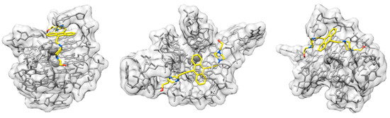 Based on sample concentration and relative peak intensities, ESI-MS can also be used to determine the equilibrium constants of complexes [13,21,22]. In particular, with respect to the complex formed by compound 4 with G-quadruplex, Kd = 0.69 × 10−6 M was calculated under these experimental conditions [21,22,23,24]. The interaction pattern of compound 4 with the G-quadruplex structure, computed by molecular docking, is reported in Figure 2. Stacking was predicted as preferred binding motif and this result is in agreement with experimental observations suggesting that planar aromatic compounds preferentially interact with G-quadruplex in this manner [2,25].