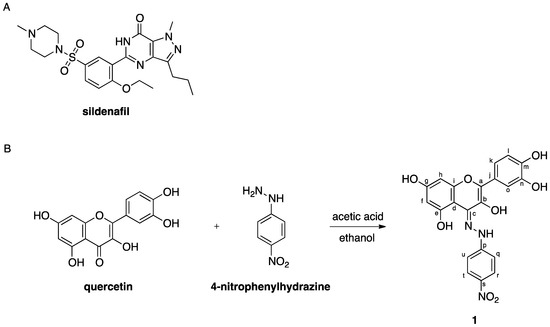 Chemical structure of sildenafil (A) and synthetic scheme for the preparation of compound 1 (B).