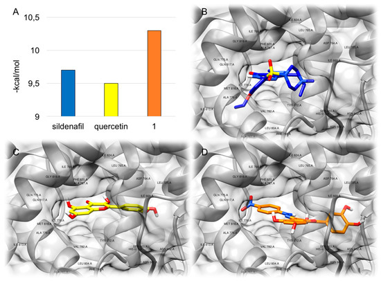 Results of the docking study for compound 1 to PDE5, in comparison with sildenafil and quercetin. (A): calculated binding energy values obtained from docking experiments. (B): docking pose of sildenafil. (C): docking pose of quercetin. (D): docking pose of compound 1.