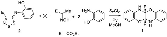 Continuing the study of ethyl 2-(hydroxyimino)propanoate reactivity, it was treated with S2Cl2, pyridine in MeCN followed by addition of o-aminophenol. Unexpectedly, a new compound, 1, a yellow solid C17H16N2O4, was being formed instead of the expected ethyl 5-((2-hydroxyphenyl)imino)-5H-1,2,3-dithiazole-4-carboxylate, 2. According to NMR, mass and elemental analysis data compound 1 is formally a product in which two aminophenol molecules are cross-linked by two carbon atoms of ethyl 2-(hydroxyimino)propanoate. Structure 1 was finally proven by X-ray analysis as ethyl 11a,12-dihydrobenzo[b]benzo[5,6][1,4]oxazino[2,3-e][1,4]oxazine-5a(6H)-carboxylate (Scheme 1).