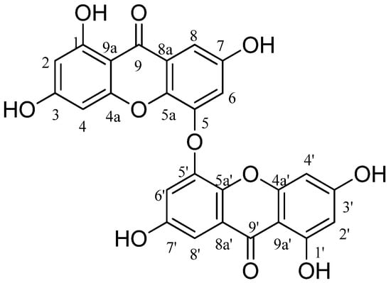 5,5′-Oxybis(1,3,7-trihydroxy-9H-xanthen-9-one) (1), yellow amorphous powder, [α]20D +12.4 (c 0.1, MeOH); UV (MeOH) λmax: 322 and 262 nm; HR-TOFMS m/z 503.0667 [M + H]+ (calcld. for C26H15O11, 503.0614); IR (KBr) νmax: 3412, 2962, 1755, 1484, 1174 cm−1; 1H-NMR (acetone-d6, 600 MHz) δH: 6.2 (1H, s, H-2, H-2′), 6.3 (1H, s, H-4, H-4′), 6.9 (1H, s, H-8, H-8′), 7.5 (1H, s, H-6, H-6′), 13.2 (1H, s, OH-1); 13C-NMR and DEPT-135 (acetone-d6, 150 MHz), δc: 179.6 (C-9), 179.5 (C-9′), 164.8 (C-3′), 164.7 (C-1′), 163.5 (C-1), 163.2 (C-3), 157.9 (C-4a, C-4a’), 153.5 (C-5a, C-5a’), 151.6 (C-7, C-7′), 143.3 (C-5, C-5′), 122.7 (C-8a’), 112.8 (C-8a), 108.2 (C-6, C-6′), 102.5 (C-8, C-8′), 102.2 (C-9a), 102.1 (C-9a’), 97.7 (C-2), 97.6 (C-2′), 93.5 (C-4), 93.4 (C-4′).
