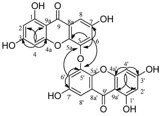 The 13C-NMR spectrum demonstrated the presence of a total of 26 carbon signals, which were classified by their chemical shifts, DEPT, and HSQC spectra (Figures S3 and S4) as eight sp2 methine carbons, two carbonyl carbon at δC 179.53 and 179.53, 16 sp2 quaternary carbons (including two sp2 carbons and 14 sp2 oxygenated carbons). These functionalities accounted for 14 out of the total 20 degrees of unsaturations. The remaining of six degrees of unsaturation were consistent with six cyclics of bixanthones [13,14].