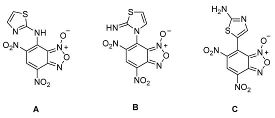 To discriminate between the possible structures, we analyzed the 1H-NMR spectrum, in which three signals in aromatic region were present—one singlet belonging to the benzofuroxanyl moiety and two doublets derived from the 2-aminothiazole moiety.