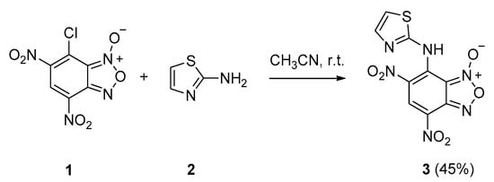 In a round-bottom flask, 7-chloro-4,6-dinitrobenzofuroxan (1) (156 mg, 0.6 mmol) and 2-aminothiazole (2) (120 mg, 1.2 mmol) were added and dissolved in acetonitrile (10 mL). Immediately after mixing, the solution became dark brown. The mixture was stirred at room temperature overnight. The reaction course was monitored by TLC (eluent: ethyl acetate/acetone 9/1). The product was purified by a chromatography column on silica gel (eluent ethyl acetate/acetone 9/1). The pure product yield was 89 mg, 45%.