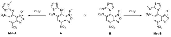 The 1H and 13C spectra were recorded on an Inova 600 (Varian, Palo Alto, CA, USA) spectrometer operating at 600 MHz (for 1H-NMR) and 150 MHz (for 13C-NMR). Chemical shifts refer to the solvent for 1H and 13C-NMR (δ = 1.96 and δ = 118.26, respectively, for CD3CN; δ = 2.50 for 1H-NMR in DMSO-d6). Signal multiplicities were established by Distortionless Enhanced by Polarization Transfer (DEPT90) experiments. Chemical shifts were measured in δ. J values are given in Hertz. Electron spray ionization mass spectra (ESI-MS) were recorded with a WATERS ZQ 4000 instrument (Waters Corporation, Milford, MA, USA). The IR spectrum was recorded with a Fourier transform spectrophotometer PerkinElmer FT-IR Spectrum Two (PerkinElmer, Waltham, MA, USA) in the 4000−800 cm−1 wavelength range using a NaCl cell. The UV/Vis spectrum was recorded using a PerkinElmer UV-Vis Lambda 12 spectrophotometer (PerkinElmer, Waltham, MA, USA). Chromatographic purifications (FC) were carried out on glass columns packed with silica gel (Merck grade 9385, 230−400 mesh particle size, 60 Å pore size) at medium pressure. Thin-layer chromatography (TLC) was performed on silica gel 60 F254-coated aluminum foils (Fluka, Darmstadt, Germany). 7-Chloro-4,6-dinitrobenzofuroxan was synthesized according to the literature [19], and 2-aminothiazole was purchased by Sigma-Aldrich (Darmstadt, Germany).
