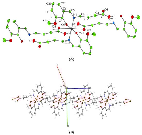 The X-ray crystal structure of 4 reveals a discrete solid-state lattice. The molecular structure of 2 is given in Figure 1A; selected bond distances and angles are listed in Table 2. Complex 4 crystallizes in the monoclinic space group C2/c. The crystal structure reflects an one-dimensional polymeric compound forming infinite chains along the c crystallographic axis. The unit cell contains four mononuclear [Cu(C12H14NO4)2] monomeric complex units and half of a badly disordered lattice MeOH molecule. The molecular structure of the monomer 4 consists of a Cu(II) ion bound to two singly deprotonated Schiff base bridging ligands which coordinate through their deprotonated phenolato oxygen atom, the imino nitrogen atom, and the double bonded oxygen atoms of the protonated carboxylic acid moieties from two neighboring molecules, thereby giving rise to a CuIIN2O4 chelation environment, and a coordination sphere reflecting a disordered octahedral geometry (Figure 1A). The Cu-N bond lengths are 2.005(2) Å whereas the Cu-O bond lengths are in the range between 1.9272(16) and 2.6167(19) Å. These values are very similar to the related bond distances reported in the literature []. Intermolecular hydrogen-bonding interactions arise between the deprotonated phenolic oxygen atoms and the protonated oxygen atoms of the carboxylic groups from the neighboring monomeric complex units enforcing the polymeric chains formation and resulting in the final 1D crystal lattice (Figure 1B, Supplementary Information Table S1).