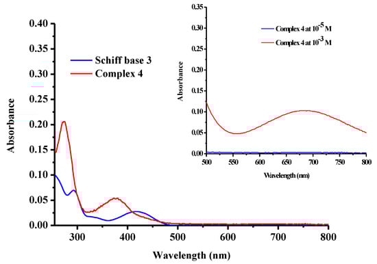 UV-Vis spectra of the Schiff base 3 (blue line) and complex 4 (red line) in MeOH at a concentration of 10−5 M. The inset graph presents the d-d transitions observed in MeOH at a concentration of 10−3 M.