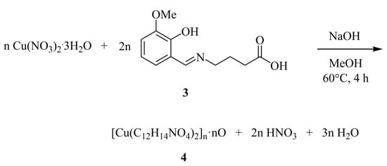Until today, a large number of crystallographically characterized metal complexes of alpha- and beta-amino acid Schiff bases have been reported in the literature [,]. However, only a few metal complexes of Schiff bases derived from gamma-amino acids have been structurally characterized via X-ray crystallography []. Herein, we report the synthesis of a novel Cu(II) complex based on a new Schiff base obtained by the condensation of ortho-vanillin with gamma-aminobutyric acid. The compounds have been physico-chemically characterized by elemental analysis, HR-ESI-MS, FT-IR, and UV-Visible spectrophotometry. The complex and the Schiff base ligand have been further structurally identified by single crystal X-ray and 1H and 13C-NMR, respectively.